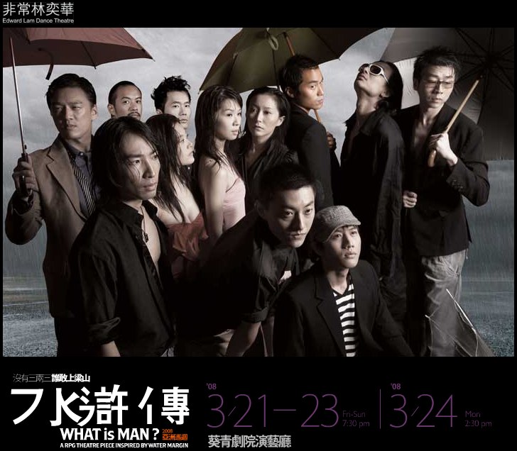2006年率先推出的是《水浒》。林奕华从武松打虎、杨志卖刀等典故中找出了“老虎”“酒”“刀”等9个关键词,对应9位身份背景不同的男人,他们前来应征黑帮电影演员,每人上台念一段独白,独白又反衬出他们内心的故事,是九种被逼上梁山的“男人之罪”。林奕华说这出戏讲的是草根男性的自我认同。