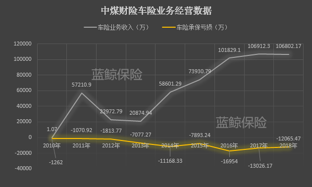 但显然,中煤财险占比较高的车险业务在支撑其保费规模的同时,却也带来盈利方面的难题,车险业务的持续亏损,成为中煤财险难以盈利的“元凶”之一。2010年以来,中煤财险业务持续亏损,2016年亏损额度达到顶峰,承保亏损1.7亿元,随后两年有所缓解,但均突破亿元亏损额度。