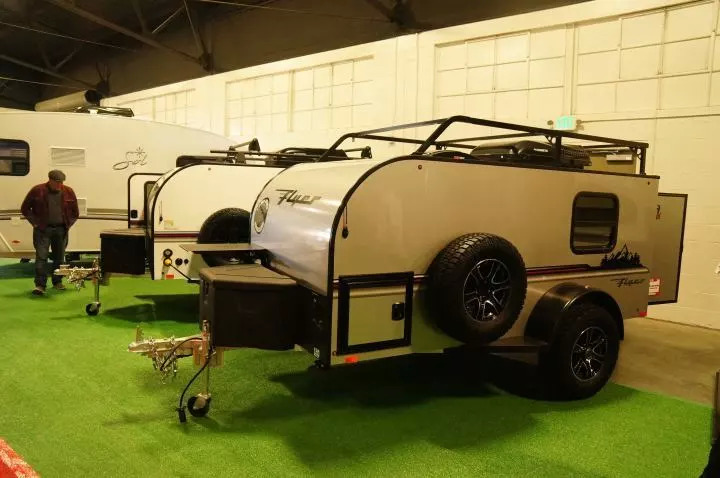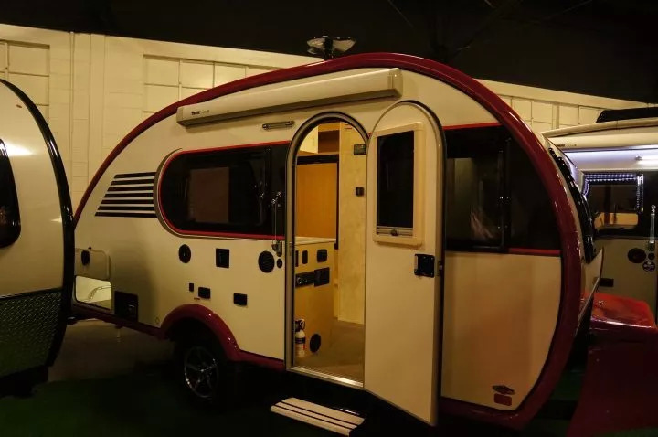 在水滴型拖挂房车领域最为出名的厂商,恐怕要数Little Guy了。Little Guy早期最主要的产品线是一些1000磅以内,轿车也能拖动的“原教旨”意义上的水滴形房车,同类产品以仅重600磅的MyPod为代表也仍在销售,但可能因为近几年美国的SUV越来越多,同时房车的购买者也要求车内有卫生间和站立的空间,在这次房车展上他们展出的主要都是一些更大型的水滴型房车,比如下图中的Little Guy Max,有功能完备的厨房和卫浴,重量也上升到了3100磅,售价则是2.6万美元。不过3000磅的重量,已经远非普通轿车乃至SUV可以拖动,其实已经跟普通轻便房车没有任何区别了。