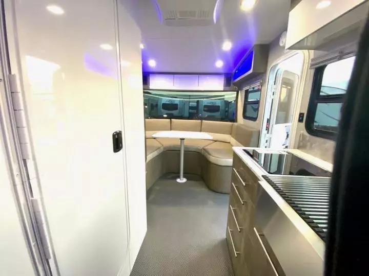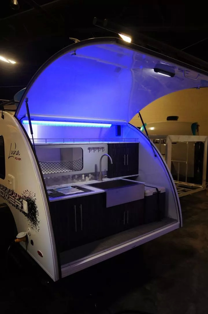 同一公司也有类似Little Guy Max的大号水滴型房车Luna,但遗憾的是虽然它在1700磅的重量下做出了大得多的体积,但仍然没有洗浴间和厕所,厨房也只能放在车尾,车内部也只能坐着,无法站立。