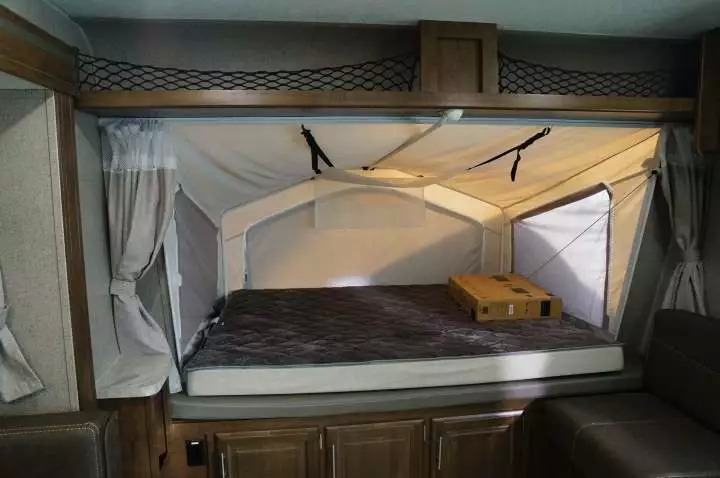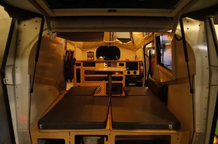 相对好一些的是下图中这种混合型房车。这种房车的主体部分仍然是硬壳,里面放置了厨房、卫生间、餐厅、客厅。而睡卧的床铺则是从四面的窗户处翻转出来。这种设计相对来说保暖性、安全感都更接近普通房车,但又在保持比较小的重量和长度(20英尺左右的长度、3、4000磅重量,类似轻便房车)的同时,能够提供很多的床铺。