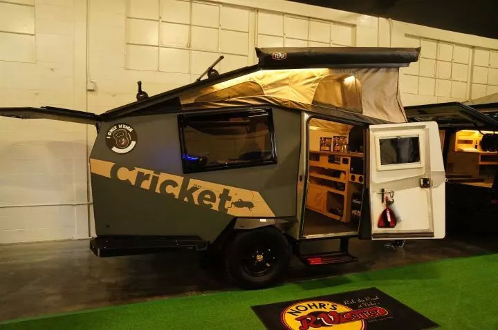 还有一些混合型房车主打越野特性。比如下面这款Texa公司生产的Cricket房车,车身和车轮都专门经过了加强,重量也比较轻,只有1800磅,可以适应非铺装道路的行走。这款房车细说起来属于Pop Up Trailer,即弹出式房车,车顶可以弹出,与车身用软布连接。这样就做到了在重量和风阻较小的前提下保证车内足够的垂直空间。但遗憾的是这款房车车内仍然没有我认为必不可少的厕所。