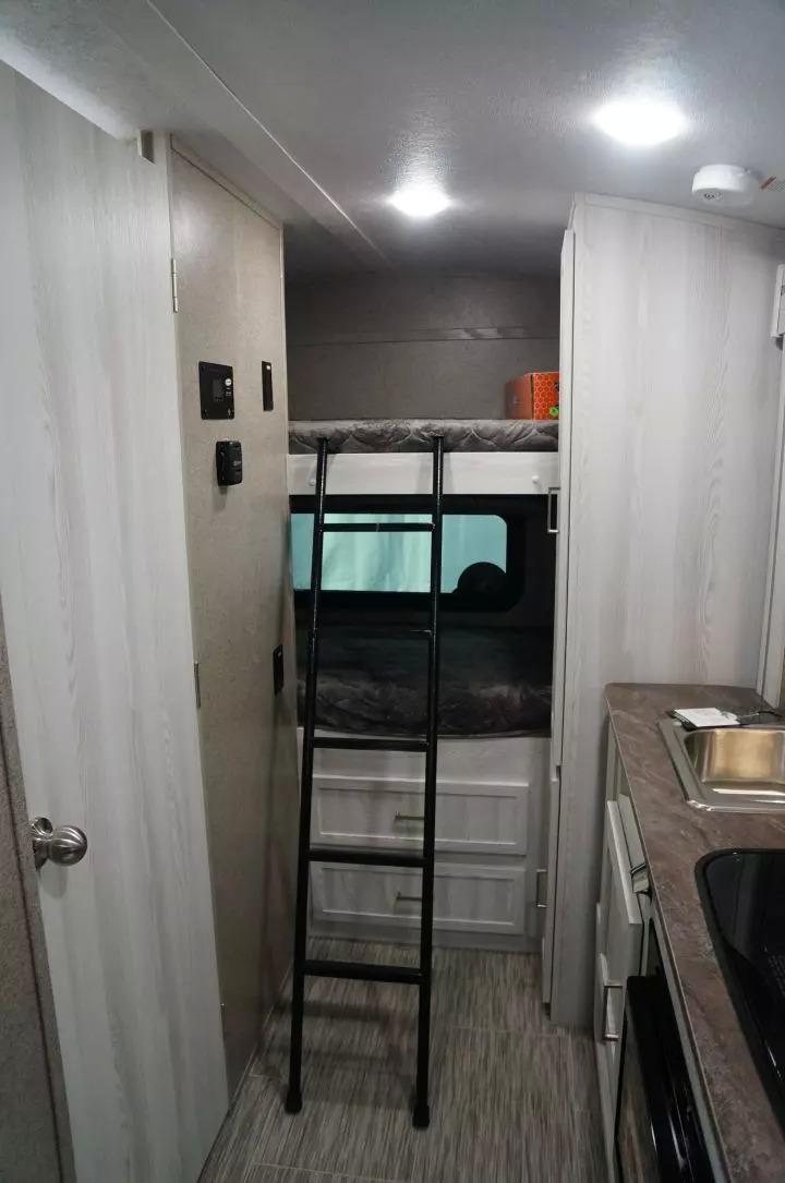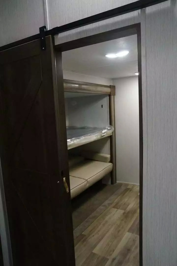 下面几张图里的拖挂型房车,车长一般在25-30尺,重量在5000-8000磅(需要皮卡或大型SUV才能拖动),售价3-5万美元。到了这个级别,基本上床铺和卫生间的空间都会比较宽敞了,不会像轻便型房车仍然比较局促。