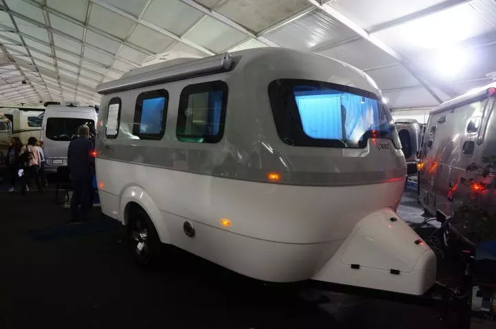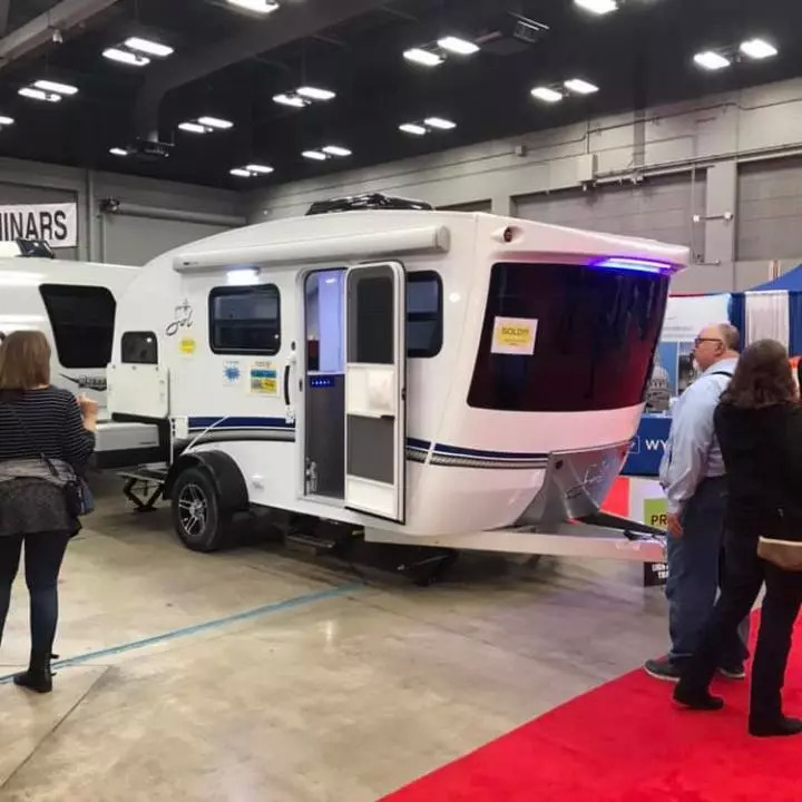 不过我们在展会上看到最喜欢的一款轻便拖挂房车,也是整个展会上我们最有可能在几年到十几年内购买的产品,是InTech公司Sol系列轻便型房车中名为Horizon的一款。这款房车虽然售价相对偏贵,19英尺长就卖3万美元,但它有一张正经的1.5米宽的双人床,前侧的可变沙发床也有1.2米宽,卫生间功能完备,车内空间比较高,内饰设计也远比大部分老气又土气的美国房车现代,特别是前倾式的车头和全景大玻璃让客厅区显得尤为开扬。而这款房车因为大量采用玻璃纤维,重量只有3100磅,也非常理想。