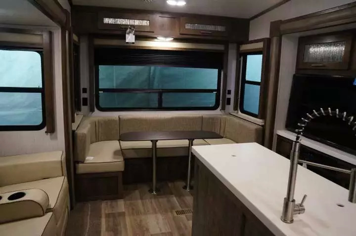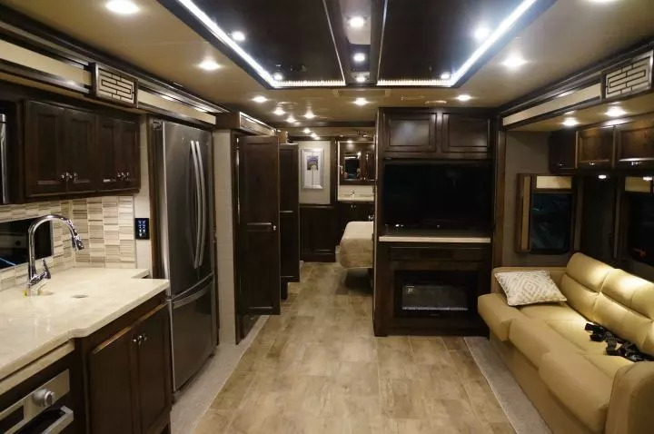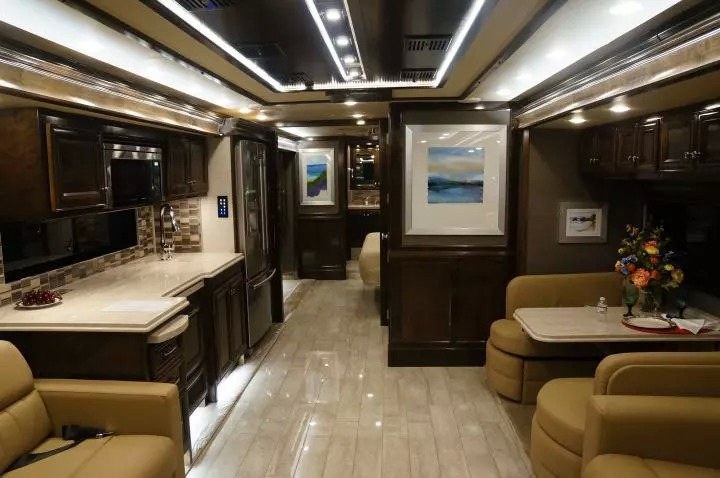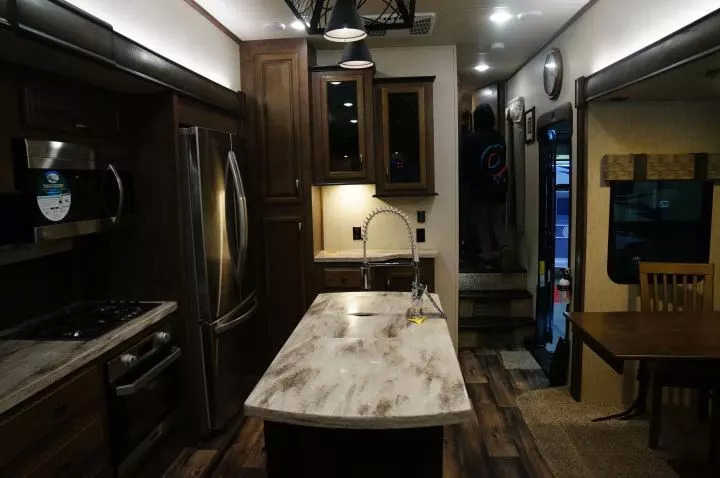 很多这类房车不仅拥有独立的餐厅和客厅,完整可封闭的卧室,干湿分离的洗手间,像下面这个房车一样,厨房中很多甚至还有岛台。