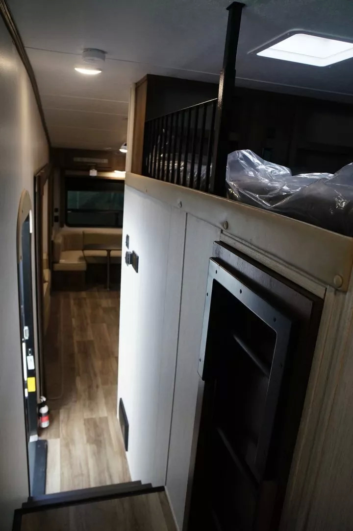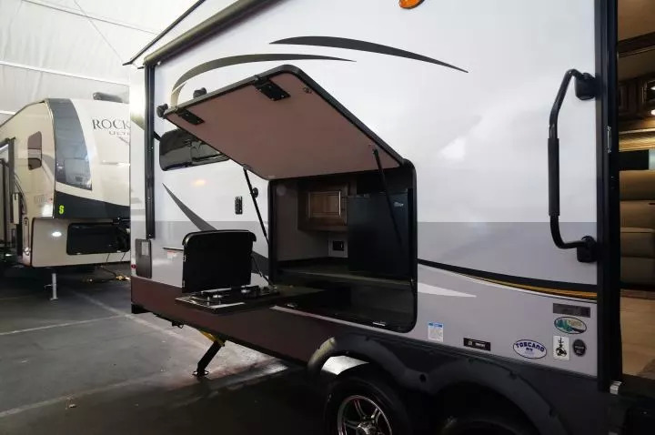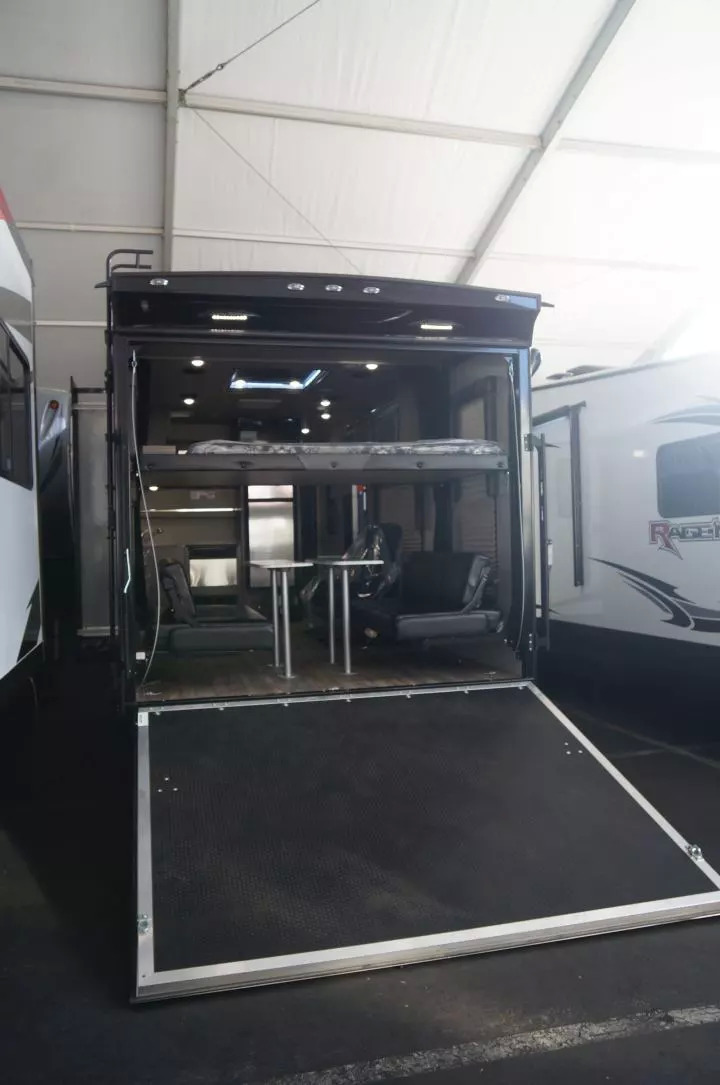 另一种特殊的大型房车,则是所谓的Toy Hauler,字面意义是玩具拖车,实际上可以理解为“带车库的拖挂房车”。这类房车为越野摩托、ATV、UTV这样的“大男人的玩具”服务,在车尾具有一个硬质车底的车库,同时有可以放下的斜坡方便车辆出入。而为了充分利用空间,这里也往往装备了电动升降床和折叠沙发,在到达目的地、摩托开出来以后,可以变成休闲和睡卧的空间。