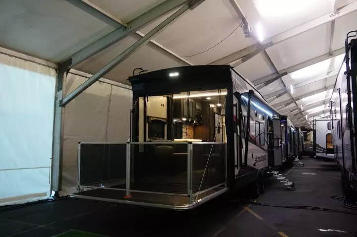 近几年,随着美国家庭购买大型皮卡越来越多,也随着美国房车消费者对房车豪华感“得寸进尺”的需求,将房车的前端做成向前突出、方便架在皮卡的后斗上方、以缩短拖挂总长度、节省重量、增加可操纵性——或者说,能够在不增加重量、总长和操作难度的前提下进一步增加空间的“第五轮”(Fifth Wheel Trailer)房车越来越流行。就我们在展出现场的观察,大型房车已经以这种样式为主了。