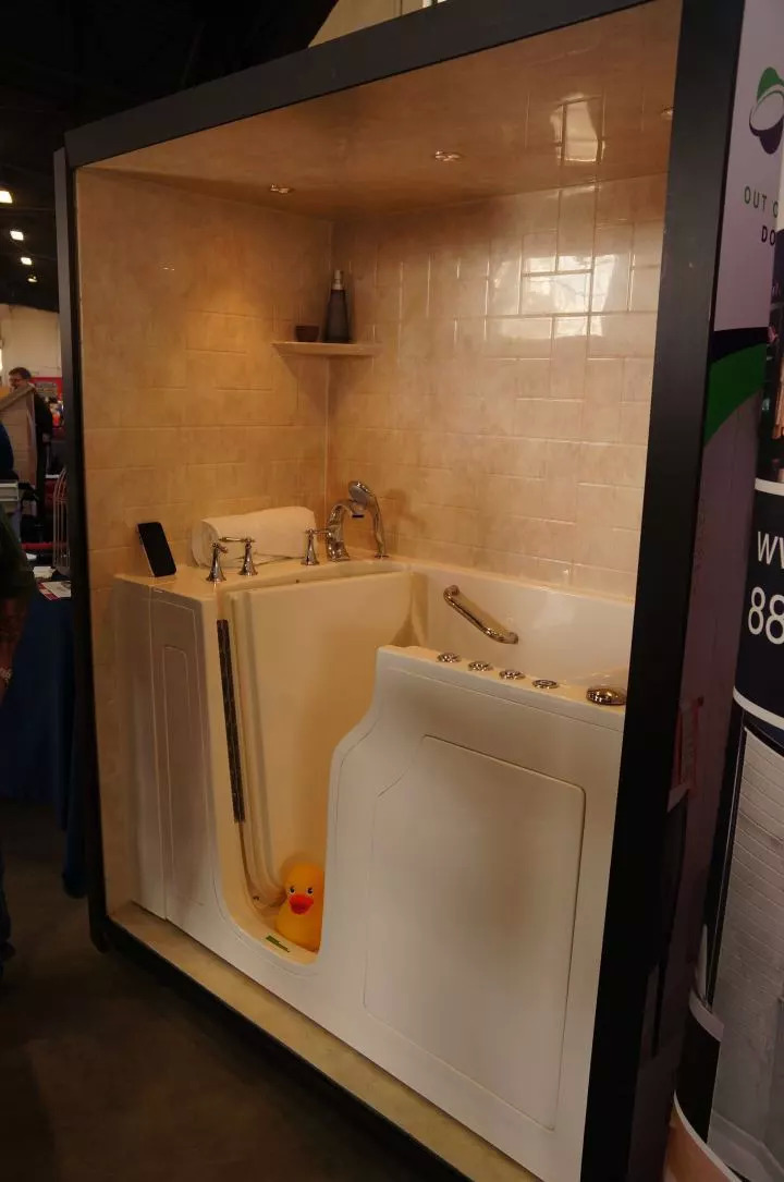 除去各种房车的展示,展会现场也有不少各种房车用品的展示,包括适合房车的功率小体积小的烹饪设备、不易碎的器皿、收纳用具、户外烤架、投影设备等等。甚至还有针对房车的整体卫浴和厨房方案。比如下面这个就在房车局促的洗手间空间内提供了浴缸。