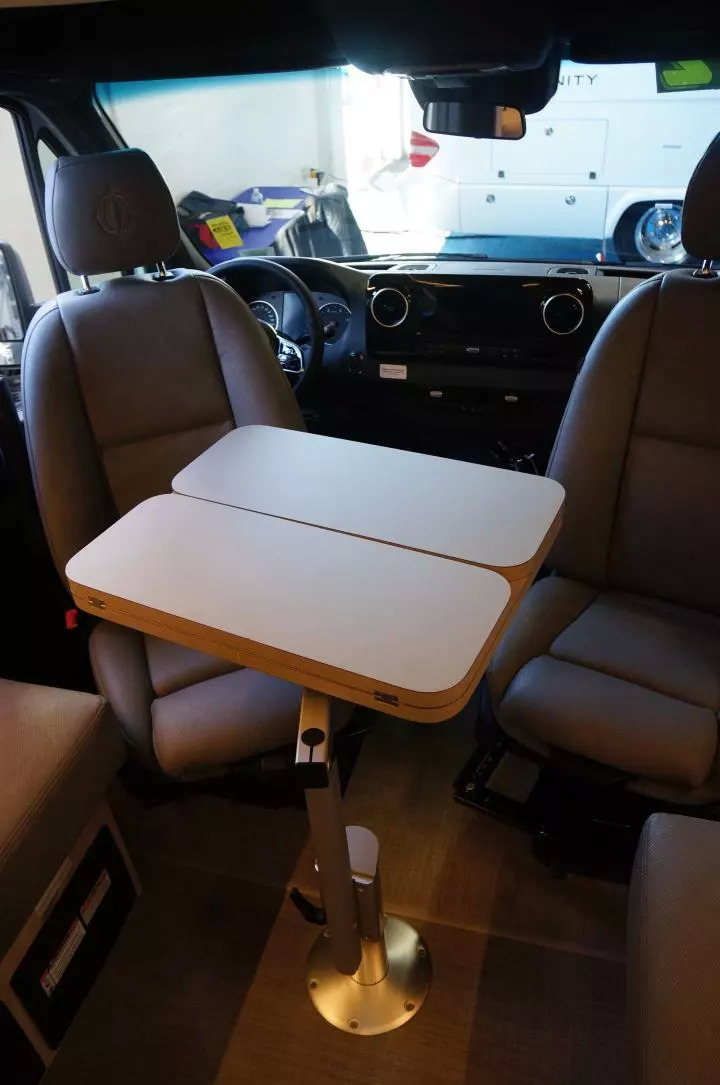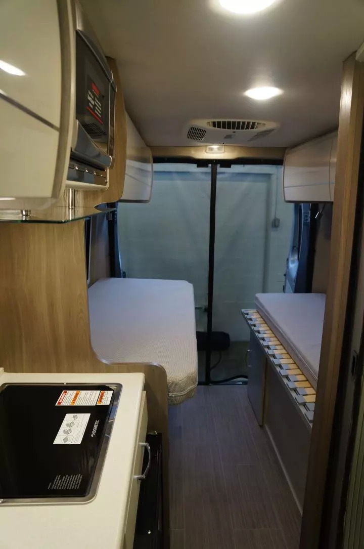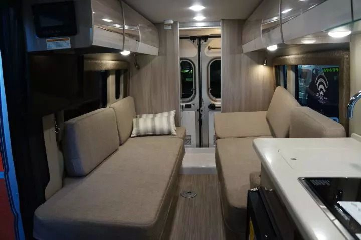 最常见的美国B型房车设计,就是像下图中这样,洗浴间在车尾,前面是两个可以兼做沙发的单人床,再前面是厨房。餐厅则由一个可折叠餐桌、一个双人沙发和驾驶室座椅后转形成。这种设计虽然不能容纳较多人数,但退休后夫妻两人旅行,其实足够用,两张单人床的设计和更宽敞的卫生间都让它比很多C型车长期居住更舒适,而且B型房车因为更矮、更短并且是一体化设计,也远比C型房车的操纵性更好,开起来就跟普通面包车差不多。在城市里旅行,停车、进地库也能参照普通车型,要方便得多。不像其他自行房车和拖挂房车要依赖房车营地。