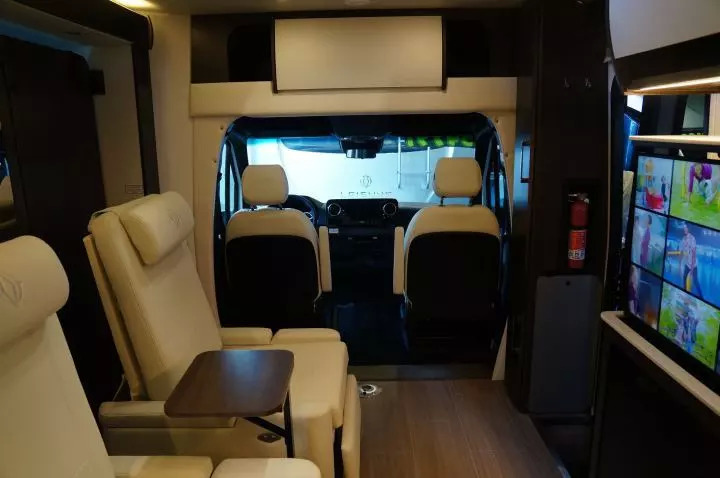 这类房车有如此宽大空间,当然首先是更长也更高,但因为道路宽度限制,房车宽度相对固定,这时候还要让内部足够宽广,就需要设计可以推出的侧边扩展室。它们可以在停车时电动推出,创造出卧式中、餐厅中的走廊,行车时则全部空间都可以用来放置家具。