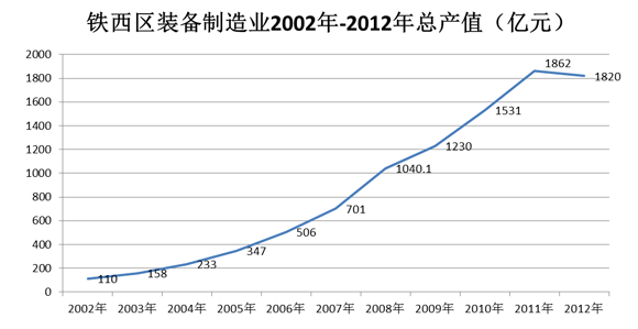 单就铁西区而言,从2002年到2012年,铁西区地区生产总值从104.9亿元增长到1105亿元,规模以上工业总产值从231.7亿元增长为2630亿元,社会消费品总额也从58亿元增长为441亿元。