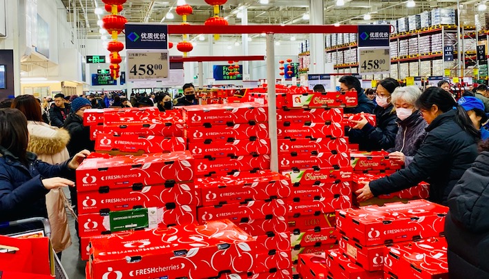 北京的田梦雪则在1月21日晚上直接开车去了山姆会员店,春节开车回家的她,打算给千里之外的家人带几箱“高级水果”。尽管婆婆已经在其广场舞微信群里拼购了一盒智利大樱桃,但田梦雪觉得山姆的水果品质更好,那里5公斤盒装JJ级车厘子的售价是458元。
