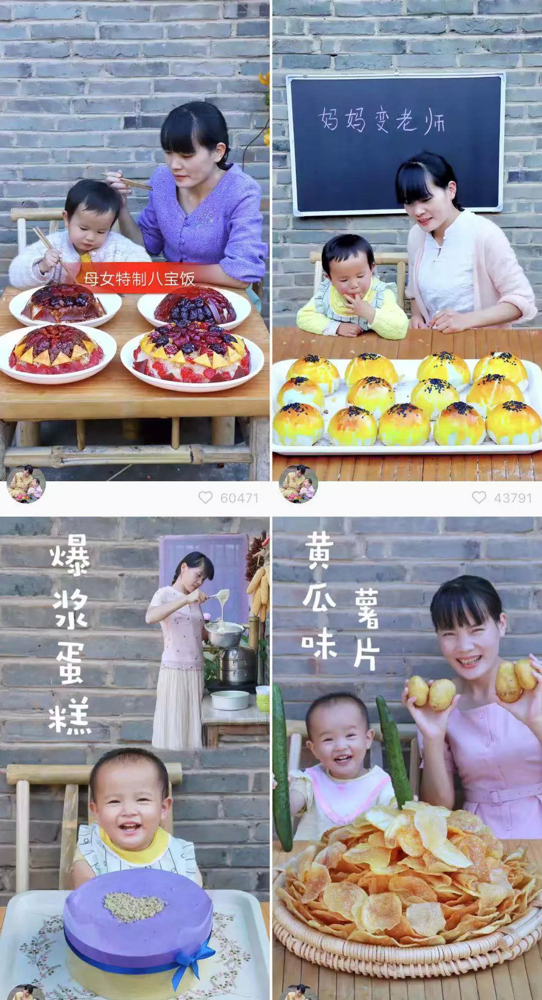 第一类是“田园想象体”。“乡野丽江娇子”的内容主要是云南宝妈用各种乡野食材给孩子做美食。服饰基调是素色棉质,画质是清雅田园风,标题多是浅粉、米黄色。这类的身体叙事特征是轻柔缓慢地摘菜、喂饭,体现自我特征的稳定。