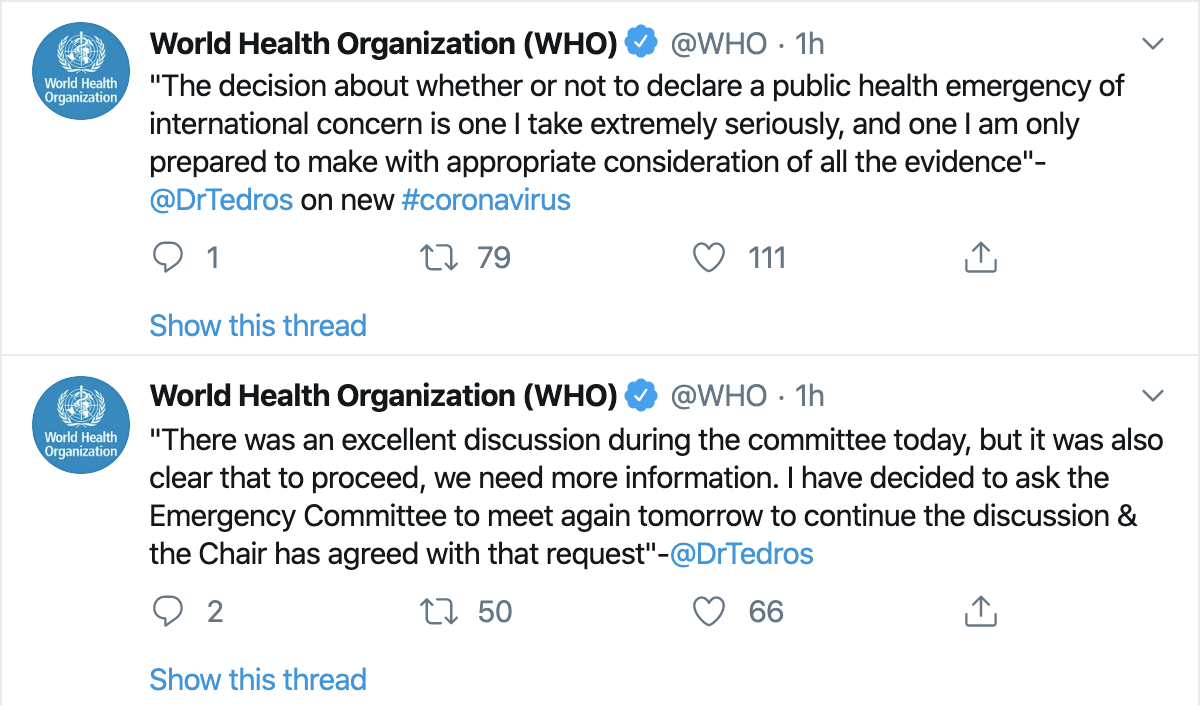世卫组织总干事将征求由国际专家组成的“突发事件委员会”的意见,并最终确定本轮新型冠状病毒疫情是否构成国际关注的突发公共卫生事件。