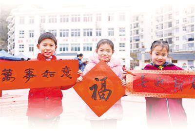 湖北恩施土家族苗族自治州宣恩县的小朋友们展示春联。王 俊摄(人民视觉)