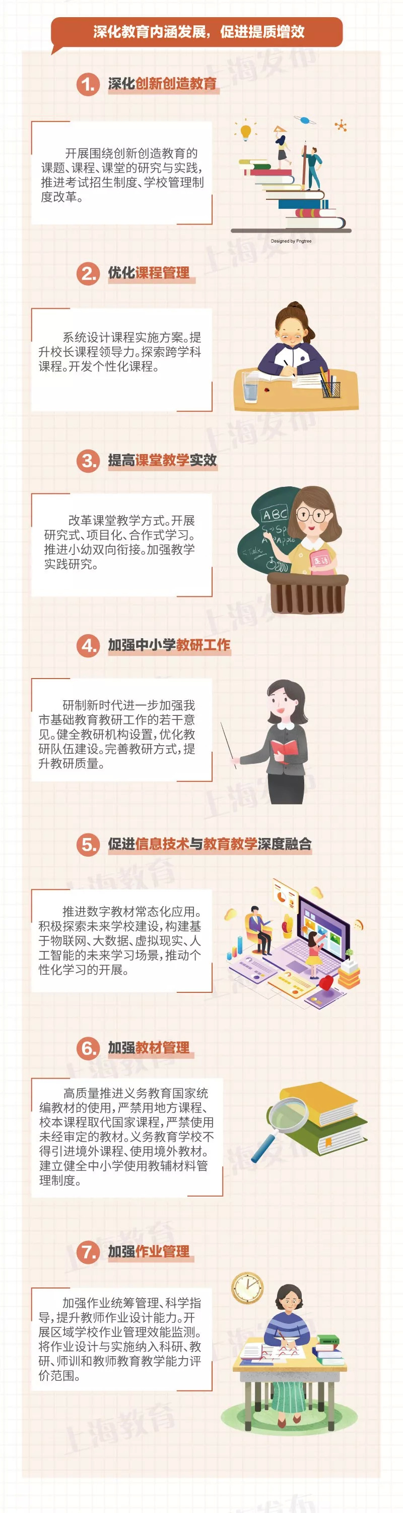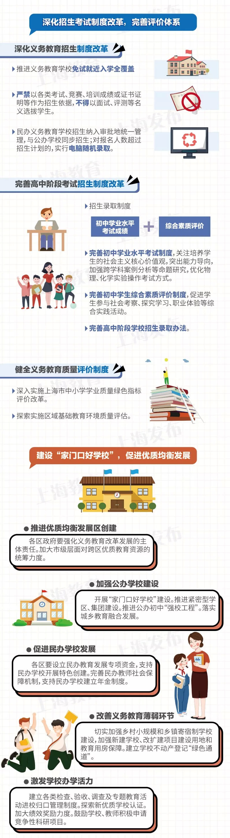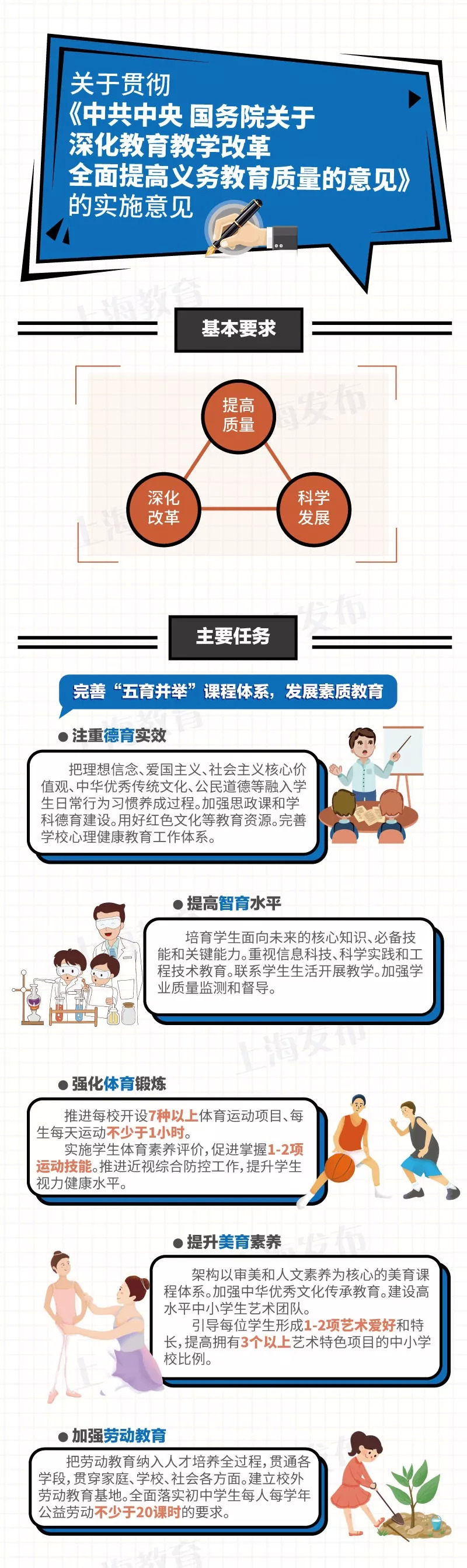 上海1月23日发布《关于贯彻<中共中央国务院关于深化教育教学改革全面提高义务教育质量的意见>的实施意见》,《实施意见》突出义务教育“五育并举”,全面提高育人质量;多措并举,积极回应社会关切;政策协同,支持保障义务教育改革发展。推进义务教育学校免试就近入学全覆盖,公民办学校同步招生,对报名人数超过招生计划的民办学校实行电脑随机录取,强调不挑选生源,有教无类。突出抓好教学质量、办学质量和区域教育质量,发展更有质量、更加公平、更加美好的义务教育。来看图解和相关问答: