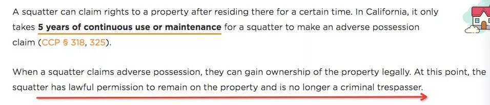 据加州民法315款-329.5条规定,房子的现住户可以通过一个叫作“逆权侵占”的法律程序 (Adverse possession) 接手不属于他们的房子。