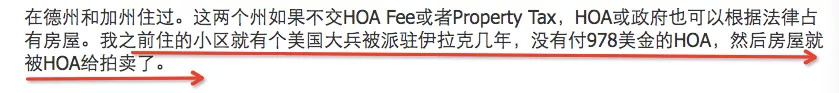 # “我之前住的小区,就有美国大兵被派伊拉克几年,没有付HOA费(物业费),然后房屋就被HOA给拍卖了。”