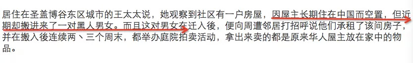 #“因屋主长期住在中国而空置,但近来却搬进一对黑人男女,还在自家后院举办拍卖活动,卖的都是原来华人物主在家中的物品。”