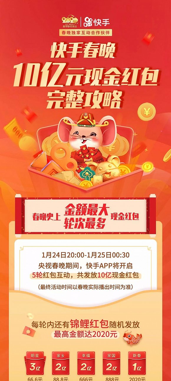 其中在春晚当晚,晚8点到次日凌晨,快手将发放10亿元现金红包,其中包括221万个“锦鲤红包”,金额从66.6元至2020元不等,除了看视频抢红包,快手还准备了海量快币和优惠券福袋。