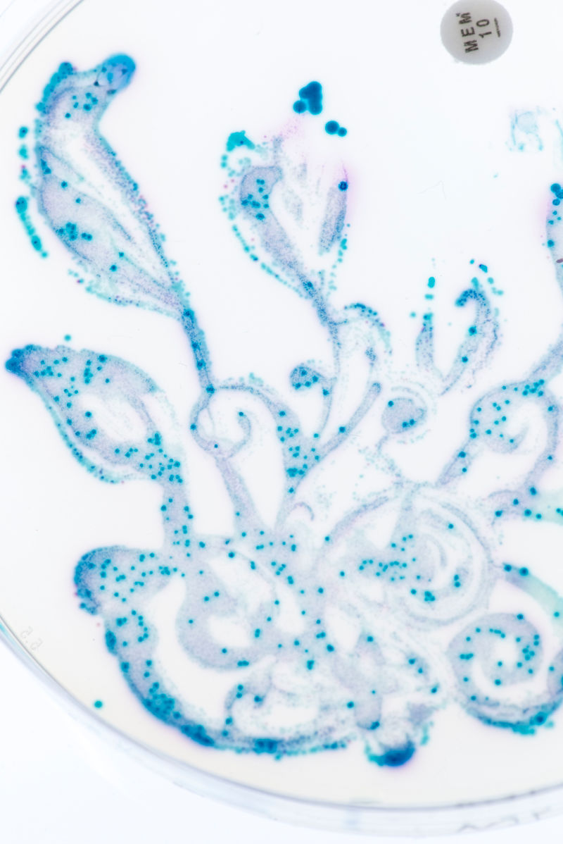 下面的照片都出自牛津大学的Nicola Fawcett博士之手,是美国微生物学会(American Society of Microbiology)举办的琼脂艺术比赛(Agar Art competition)参赛作品——照片的素材,嗯,是粑粑。Fawcett是牛津大学微生物组抗生素抗性研究团队的一员,在那里,她通过分析牛津大学学生的粑粑样本来研究抗生素、饮食、旅行及就医等行为因素对人们肠道细菌的影响。