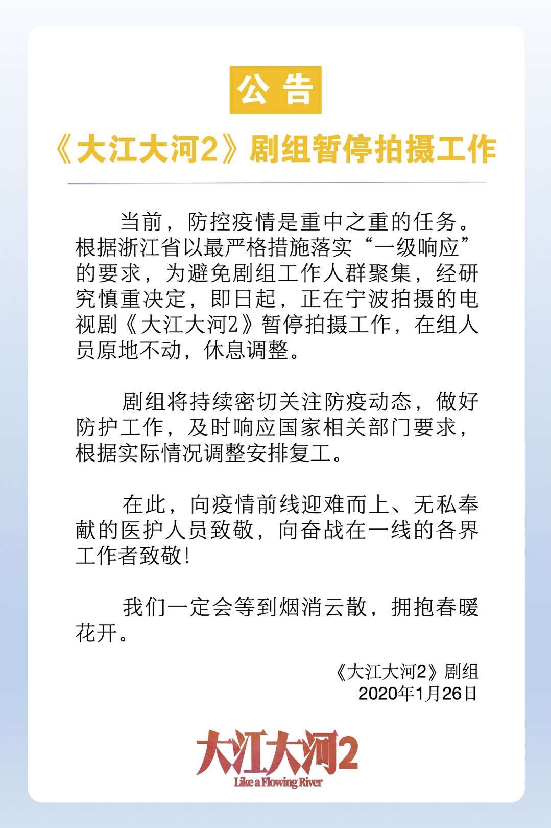 1月26日,电视剧《大江大河2》发布剧组公告,表示根据浙江省以最严格措施落实“一级响应”的要求,为避免剧组工作人群聚集,即日起,正在浙江宁波拍摄的电视剧《大江大河2》暂停拍摄工作,在组人员原地不动,休息调整,具体复工时间根据国家相关部门要求和实际情况调整。