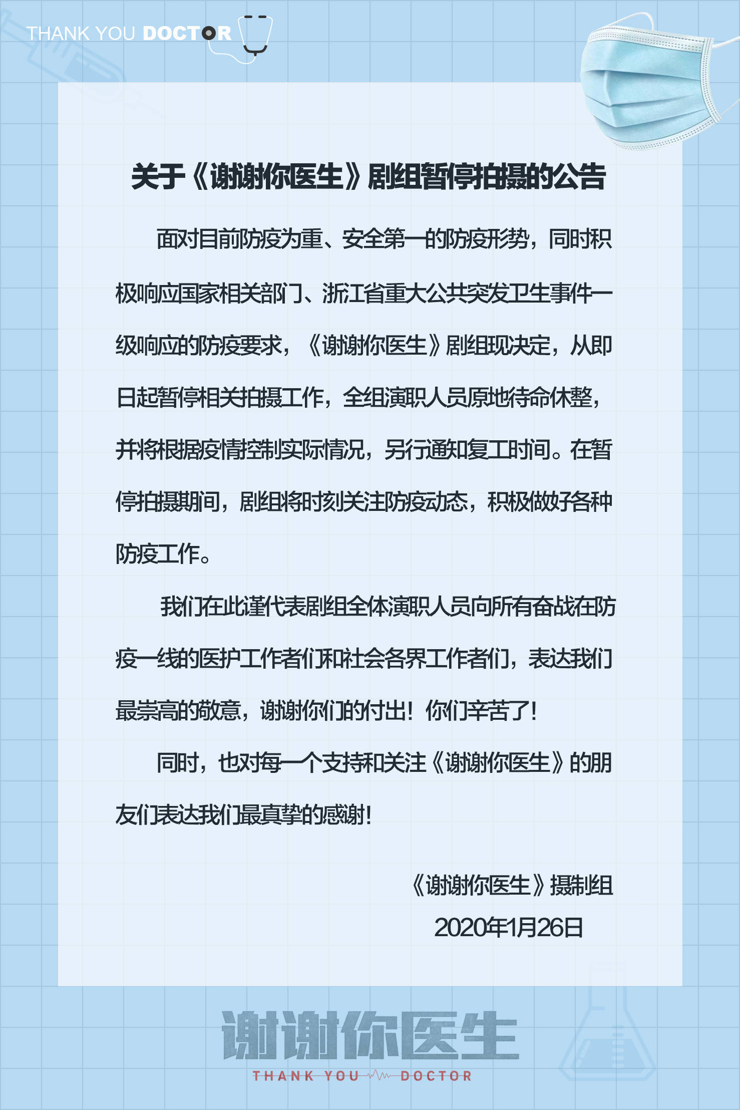 1月26日,由杨幂和白宇主演的电视剧《谢谢你医生》发布公告,剧组表示为响应国家相关部门、浙江省重大公共卫生事件一级响应的防疫要求,决定即日起暂停拍摄,全组演职人员原地待命修正,复工时间另行通知。