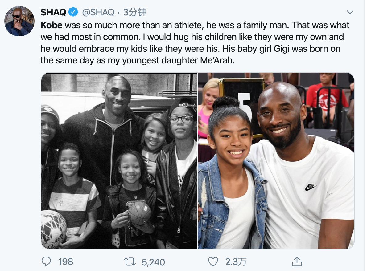 奥尼尔还在推文中提到科比的女儿吉吉与自己的小女儿是同一天出生。