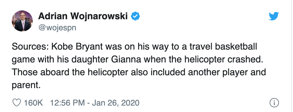 美国ESPN等媒体报道,美国太平洋时间1月26日上午9点47分,加州洛杉矶附近一架直升飞机坠机,前NBA巨星科比·布莱恩特不幸遇难,终年41岁。科比13岁的女儿吉安娜随后也被确认在失事飞机上。
