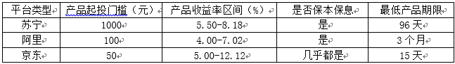 目前阿里和苏宁也有自己的理财平台,两者并无固收理财这一类型,但是根据其定期理财产品的投向,界面新闻发现其本质与京东的固收理财产品无差异,都是投向固定收益类产品。那么三者的产品相比有什么异同呢?具体情况见下表: