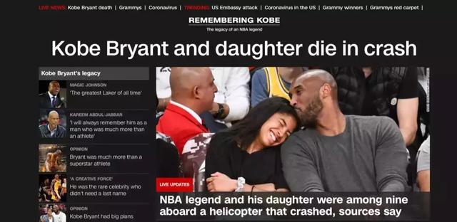 据美国体育媒体ESPN、新闻媒体ABC及娱乐新闻媒体TMZ等多家媒体报道,NBA巨星科比·布莱恩特在当地时间1月26号,于加利福尼亚州洛杉矶县卡拉巴萨斯的一场直升机坠机事故中身亡。他13岁的女儿吉安娜·玛丽亚·奥诺尔·布莱恩特也不幸离世。