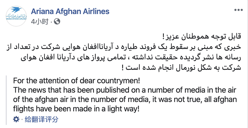 飞机所属的航空公司也未能明确。阿富汗的阿里亚纳通讯社和俄罗斯卫星通讯社等媒体此前报道称,失事飞机属于阿里亚纳航空公司。但该航空公司已在脸书上发表声明,否认了这一说法,称该公司所有航班均运行正常。