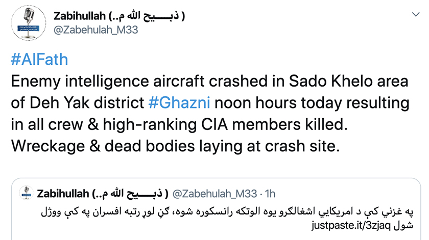 在失事飞机或隶属于外国公司的消息传出后,阿富汗塔利班发言人通过社交媒体宣称,当地时间27日中午,塔利班在加兹尼省击落一架隶属美国中央情报局(CIA)的飞机,机上CIA高级官员无人生还。