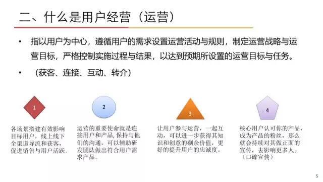 有个母婴零售服务的头部品牌企业“孩子王”,已经彻底转型用户经营了。它把所有的广告宣传和市场推广费用都砍掉,转向增加对客户的服务费用,保证位每个用户每年投入150块钱的服务费。在现在这个新技术时代,经营用户的成本已经远远低于你去忽悠客户的成本了。因此,企业营销的重心逐步转向了“用户经营”——有别于互联网企业的用户运营,我们认为,它应该是以下一系列活动:以用户为中心,基于企业整体战略而制定经营目标与策略组合,同时配合相应的运营模式与规则,以组织化的方式进行运营维护。