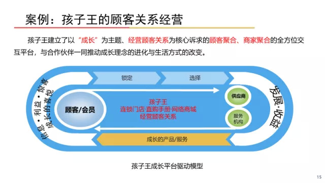 孩子王的商业模式就是建立在其顾客关系经营基础上的。下图是孩子王的商业模式,大家可以看到,它向下锁定消费者,向上锁定服务商和供应商,建立了以“成长”为主题、经营顾客关系为核心诉求的顾客聚合、商家聚合的全方位交互平台,孩子王与合作伙伴一同推动成长理念的进化与生活方式的改变。