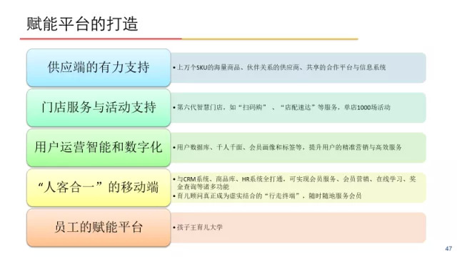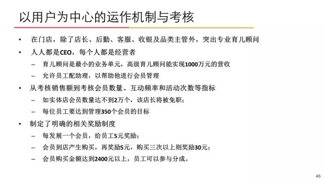 最后从卖产品到卖解决方案。卖用户真正需要的东西,而不仅仅是你想卖的东西。针对用户典型场景的痛点与刚需,针对目标消费群的个性化需求,进行产品组合和服务内容的调整。孩子王卖奶粉、纸尿裤挣来三分之一的钱,卖孩子的各种培训课程、妈妈服务等挣另外三分之一的钱,还有三分之一的钱来自卖理财和保险。孩子王和妈妈顾客们成为朋友、闺蜜之后,就有了卖保险的市场了,因为中国家庭基本上都是女性理财,从这个角度可以说中国是一个母系社会。
