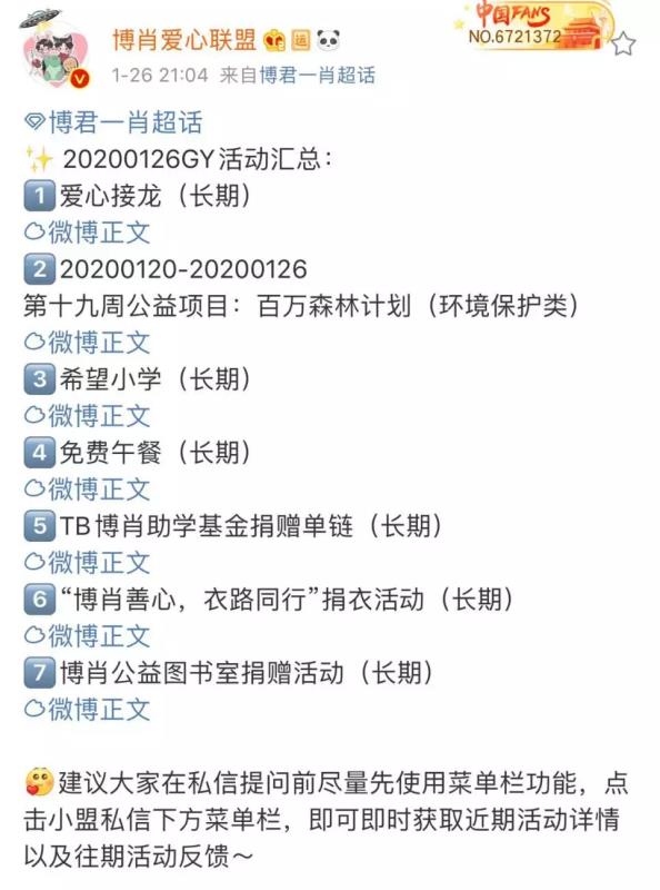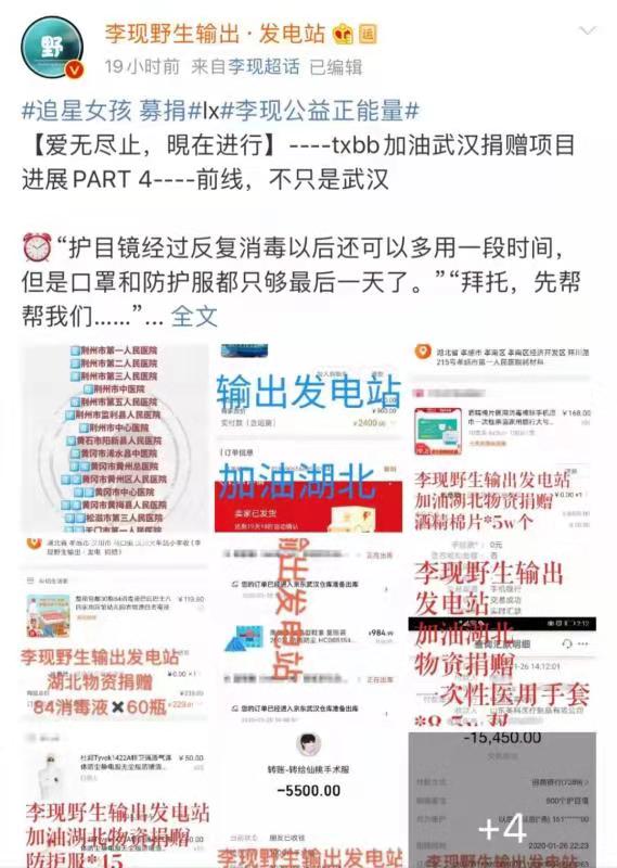 同样捐赠多种医疗物资,帮助武汉解决医疗物资紧缺燃眉之急的,亦不乏周震南全球后援会、TFBOYS粉丝站、等各家粉丝。