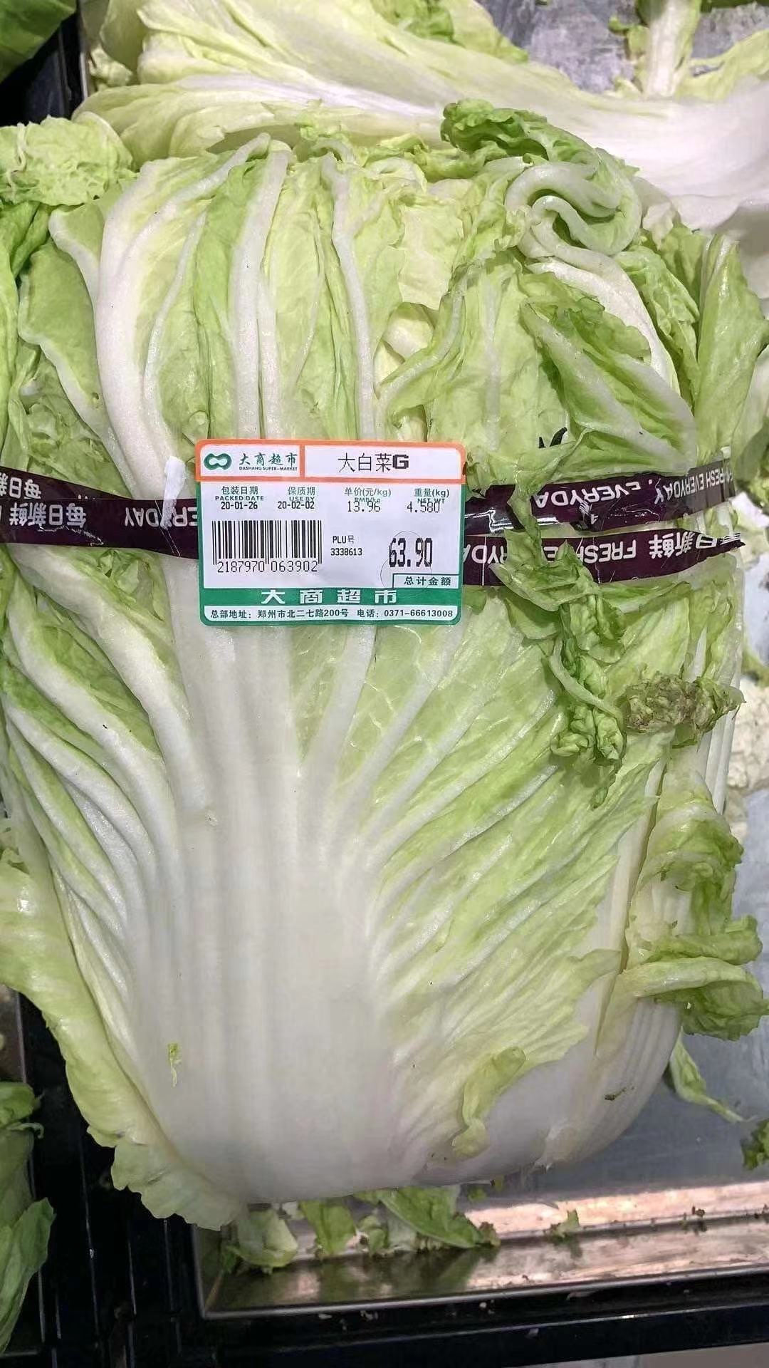 昨天不少郑州市民反映称,郑州市北二七路大商超市及世纪联华橄榄城店,白菜价格暴涨。一斤白菜定价近7元,一棵白菜买下来竟需要63.9元。
