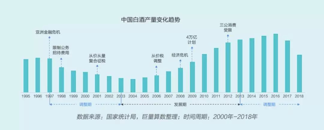 白酒市场在过几年中实际上也是几起几落。先是经历了高速增长的时期,又随着泡沫破灭放量下跌,经历了一个低价去库存的时期,直到近几年价格触底反弹之后,又重新走上了平稳上涨的时期。