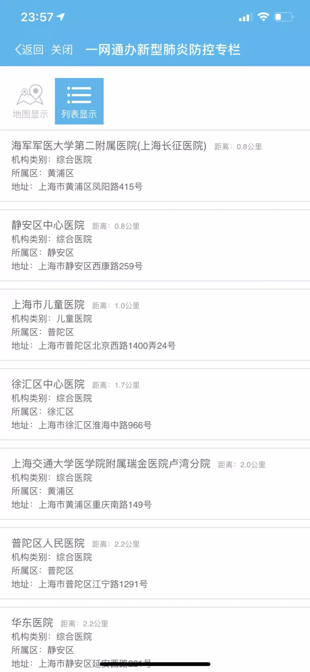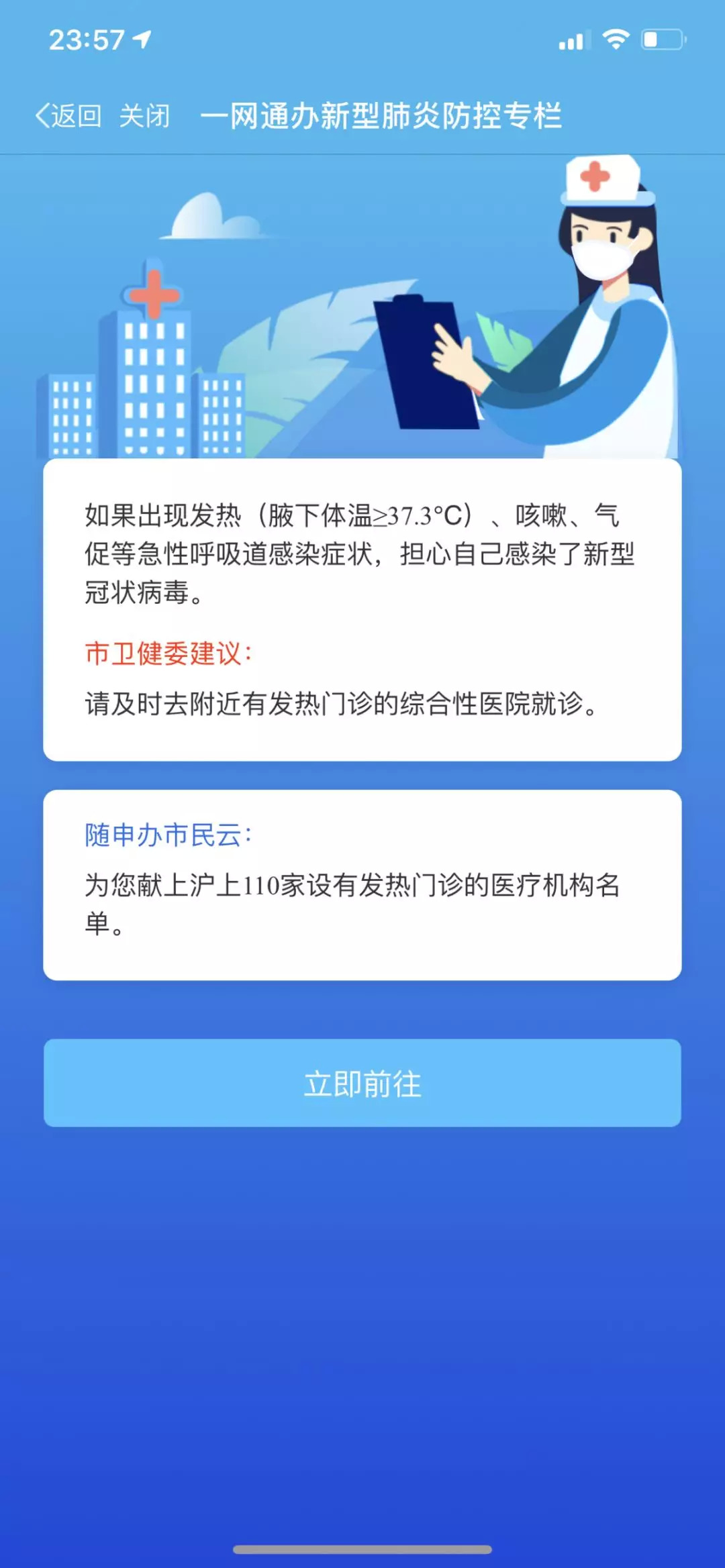 如果出现发热(腋下体温≥37.3℃)、咳嗽、气促等急性呼吸道感染症状,担心自己感染了新型冠状病毒,市卫健委建议:请及时去附近有发热门诊的综合性医院就诊,可通过“发热门诊医疗机构”服务,查看沪上110家设有发热门诊的医疗机构名单,服务提供地图显示和列表显示两种方式,可查看距您最近的的发热门诊医疗机构。