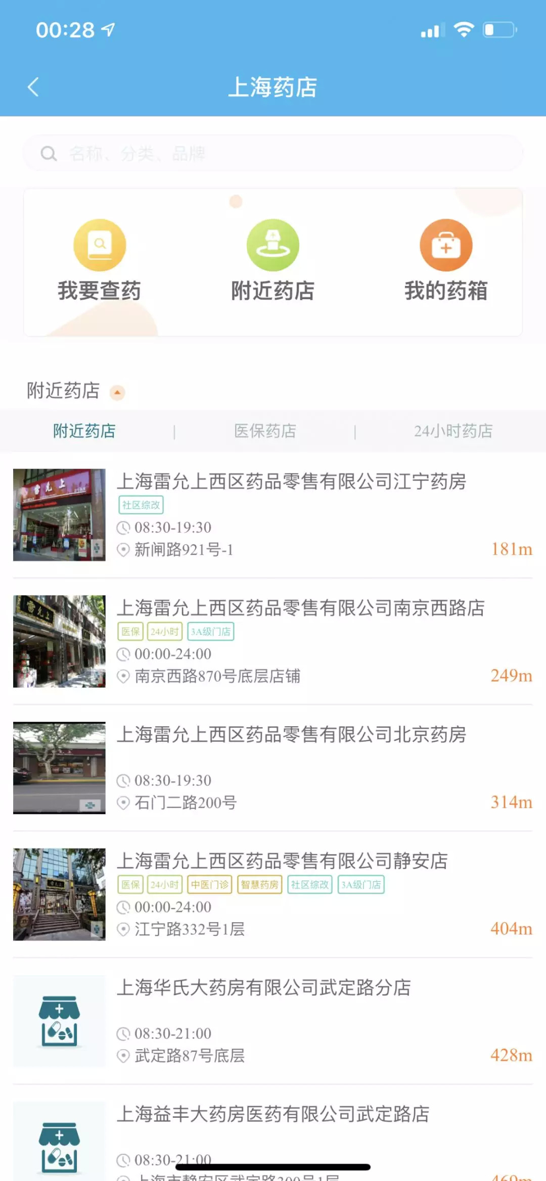 “上海药店”服务提供查药服务、医保药店查询等服务,“随申办”还可以根据用户定位,提供附近药店以及24小时营业药店的查询服务。“随申办”小程序使用方法见→“随申办”超级应用可查询附近药店