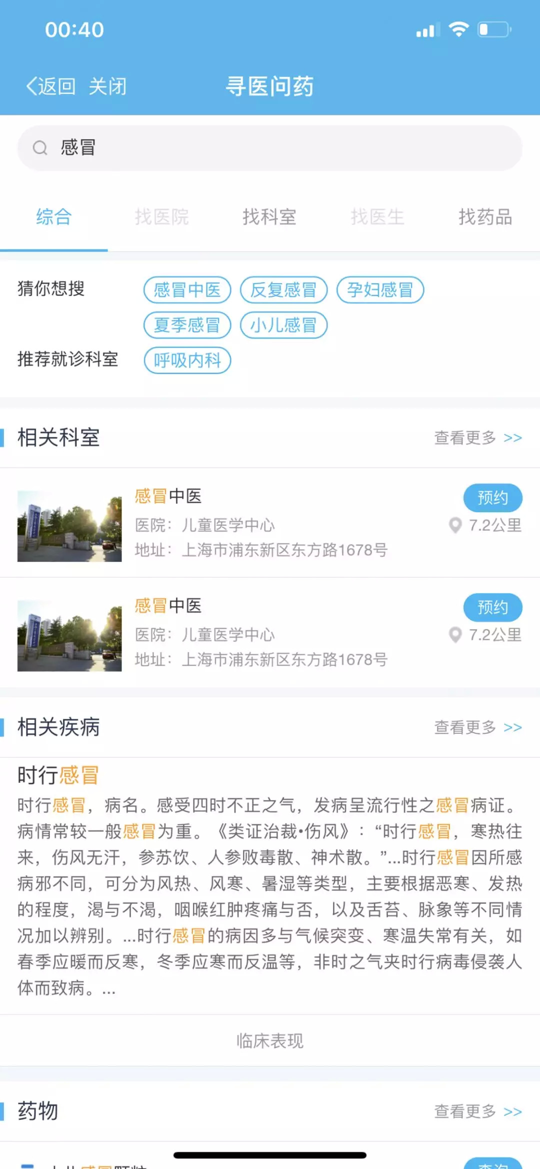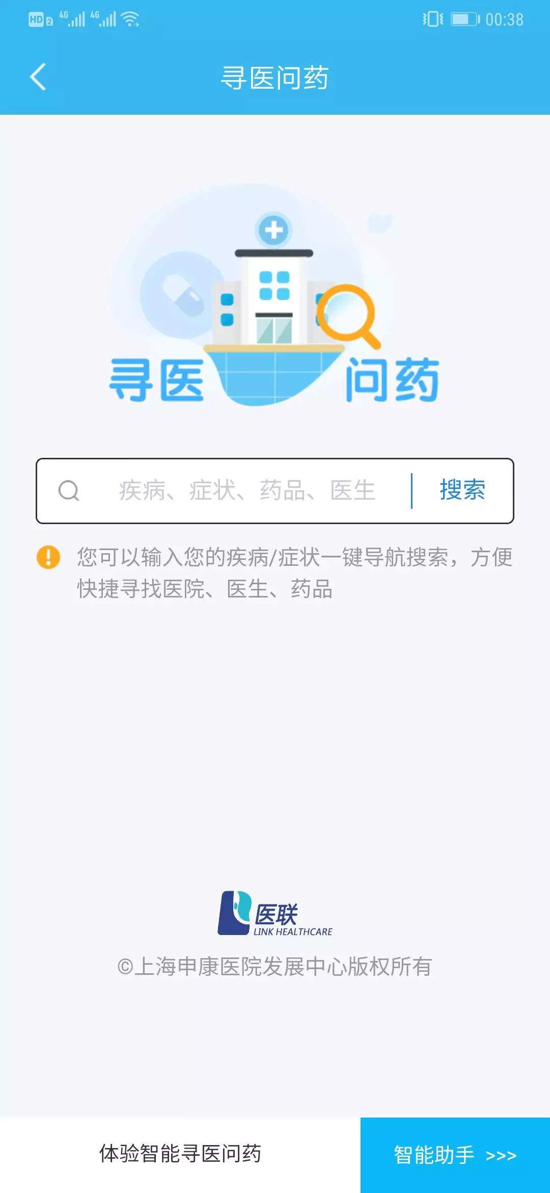 “寻医问药”服务为用户提供在线寻找医院、医生、药品的服务,可通过搜索关键词进行检索;同时用户还可通过智能助手体验智能寻医问药在线智能导诊、智能问药等。