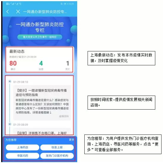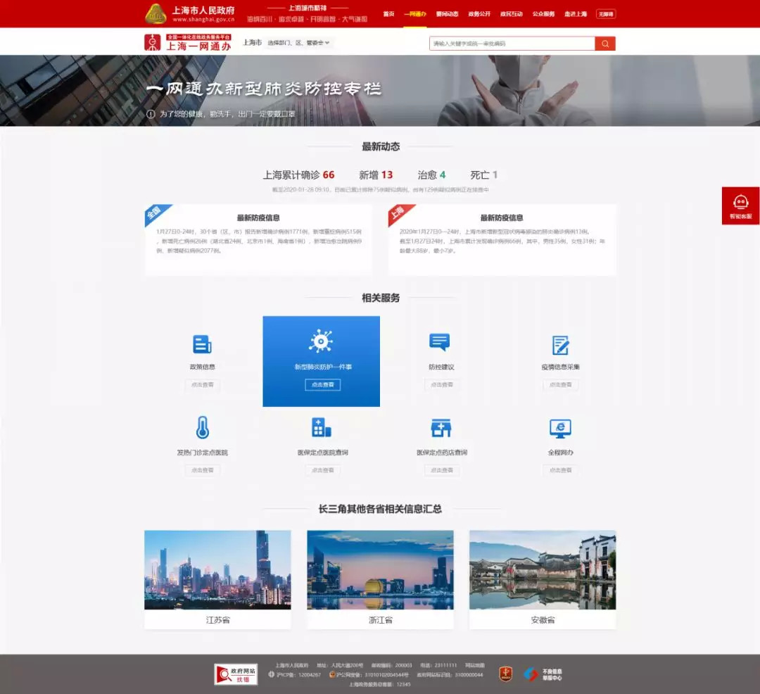 “一网通办”多端联动,上线“一网通办新型冠状病毒感染的肺炎防控专栏”,提供上海疫情最新动态、实时防控公布(全国/上海)、相关查询服务、长三角其它省市相关信息汇总栏目。使用指南详见: