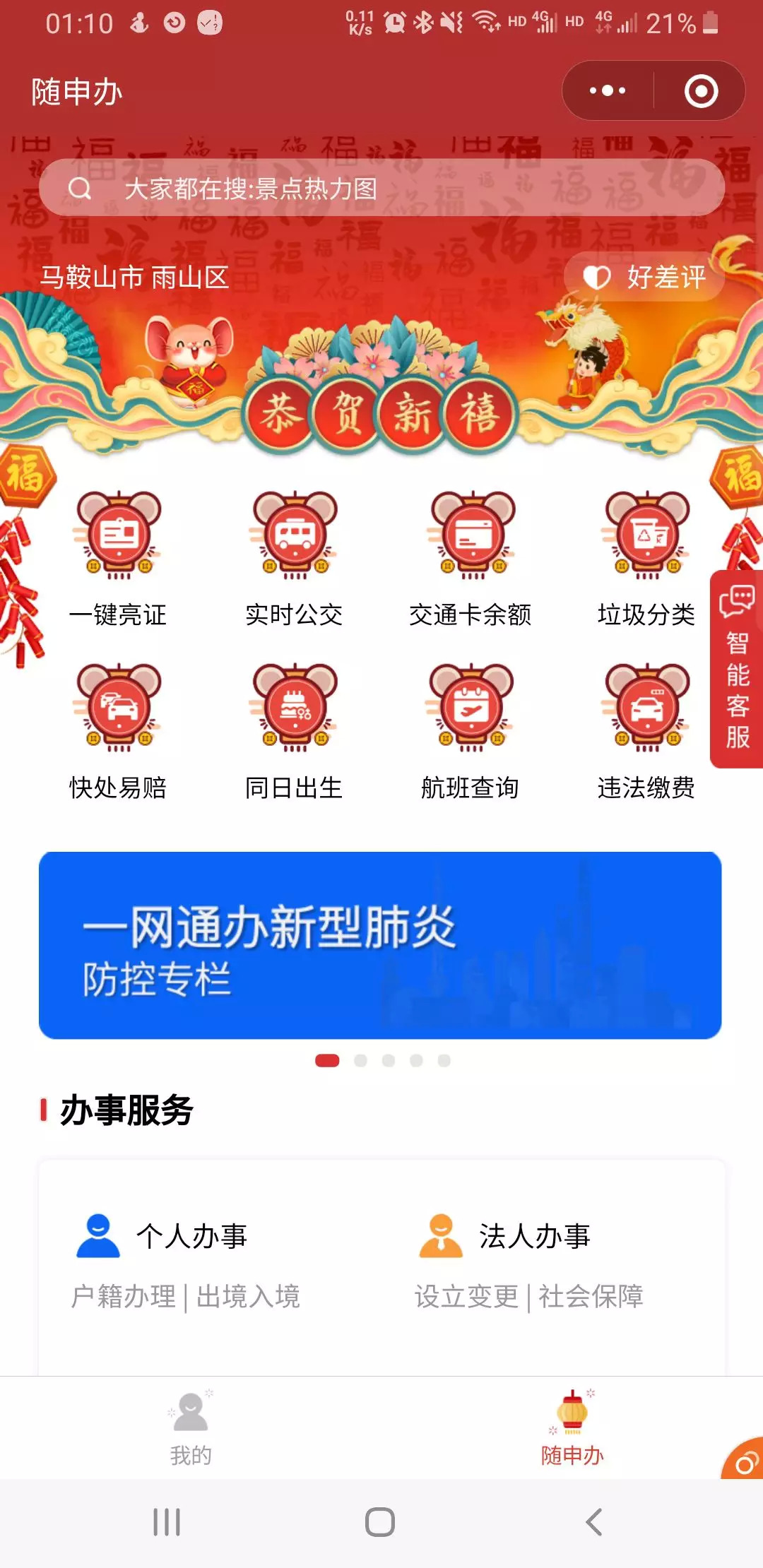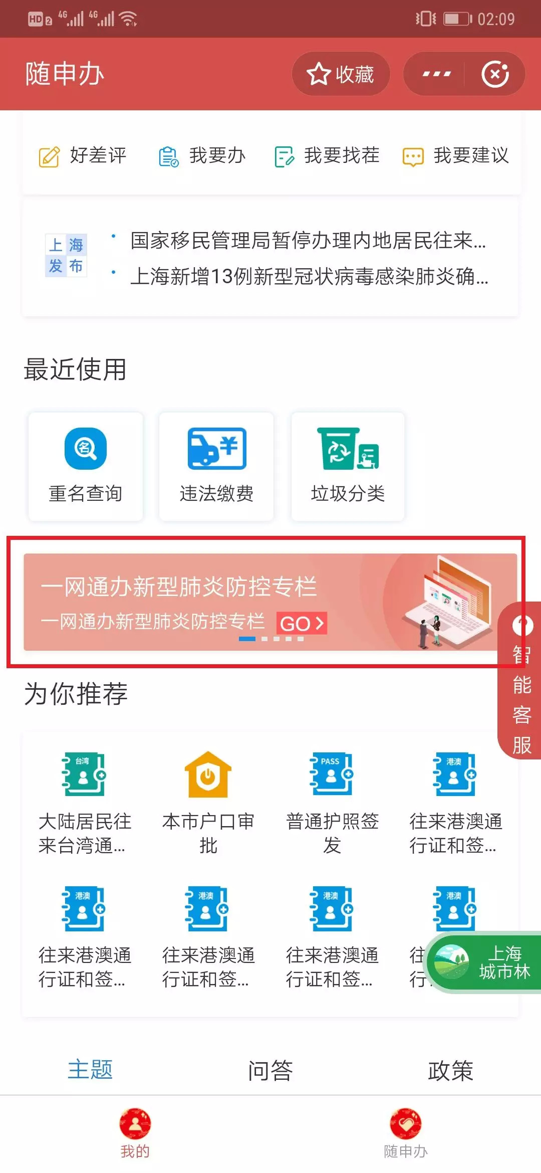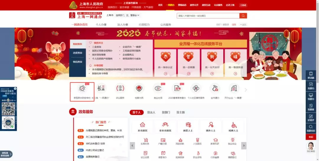 通过“一网通办”总门户进入到“一网通办新型冠状病毒感染的肺炎防控专栏”