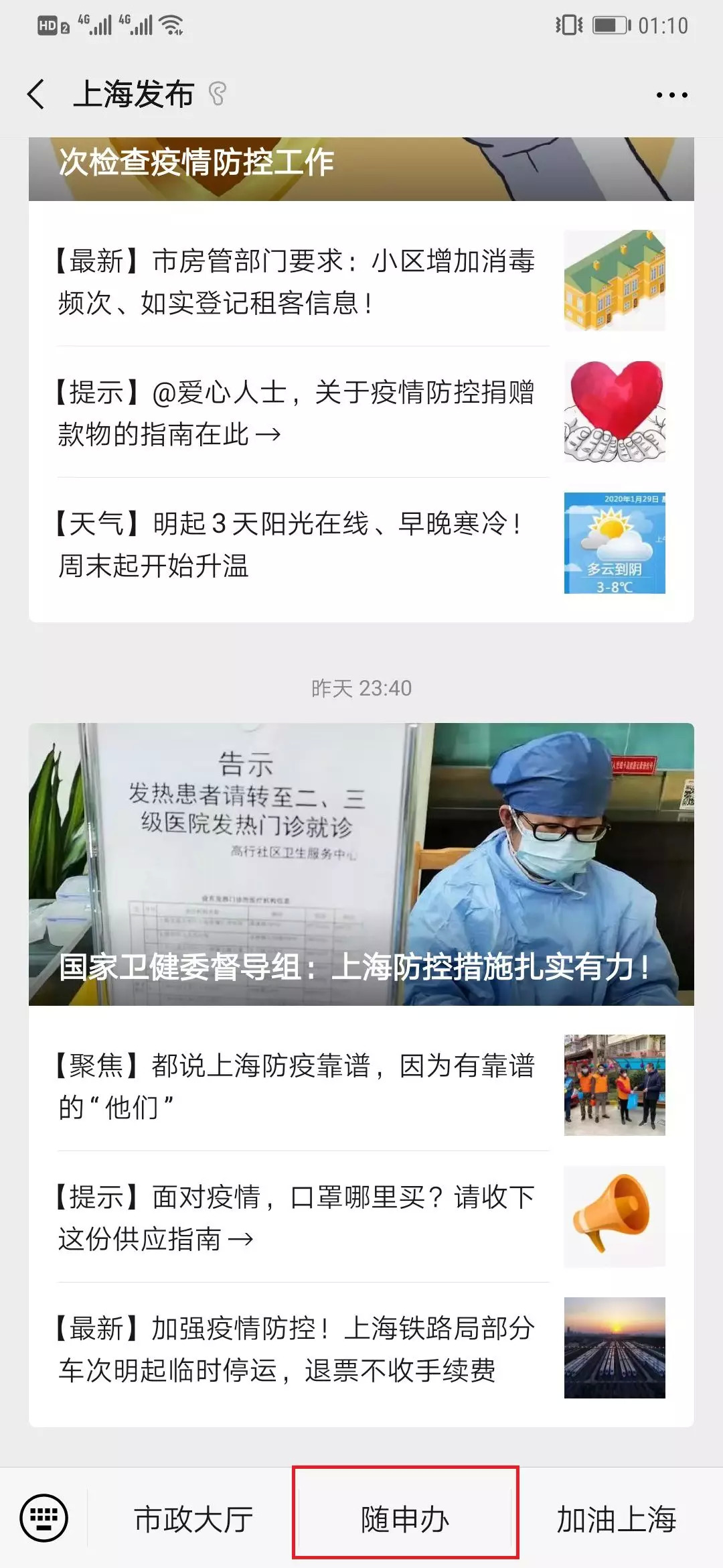 方式二:点击“上海发布”微信公众号下发的“随申办”频道,进入到“随申办”微信小程序也可进入“一网通办新型冠状病毒感染的肺炎防控专栏”。