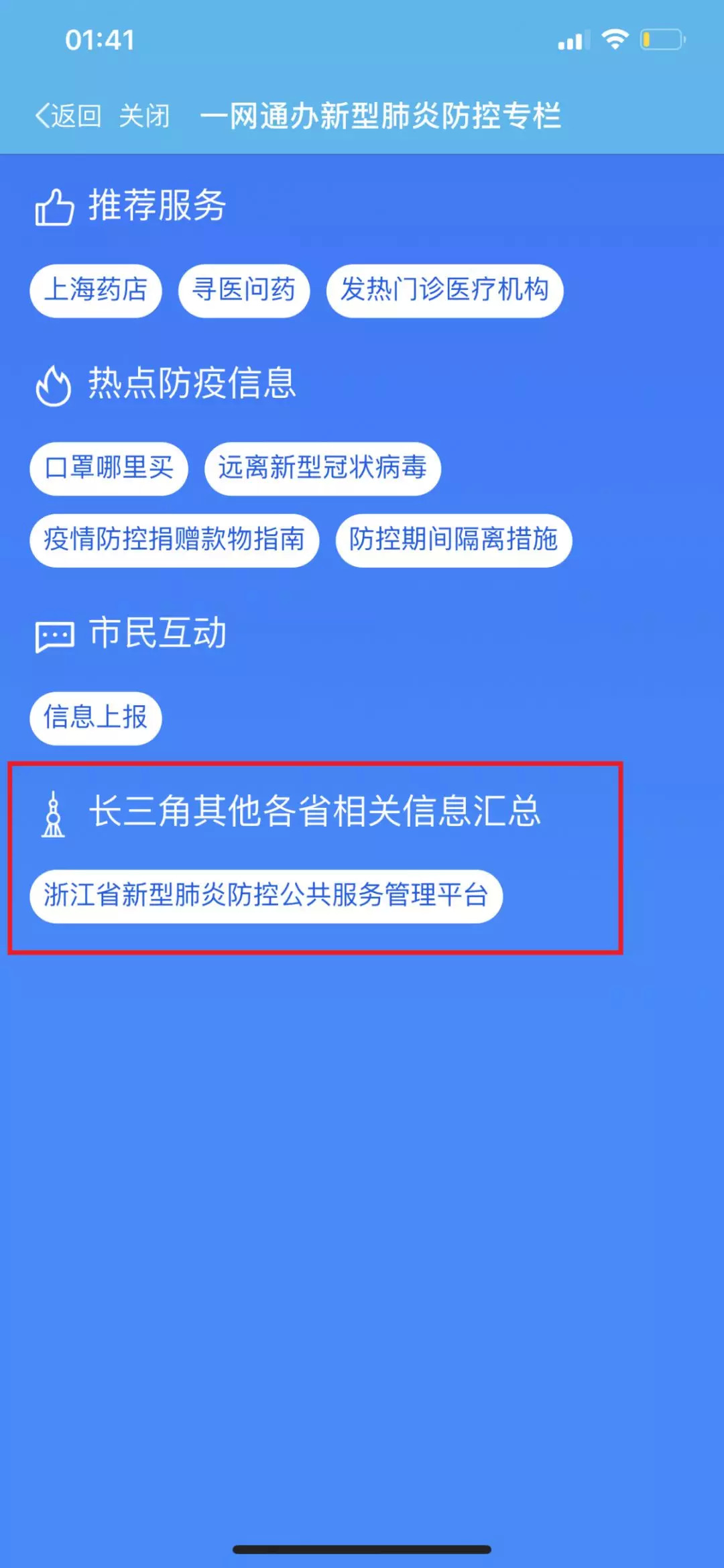 汇聚三省一市的最新疫情动态和相关服务资源,为往返长三角区域内其他各地的用户提供专版服务。目前,通过“随申办”APP可查看浙江省新型冠状病毒感染的肺炎防控公共服务管理平台。