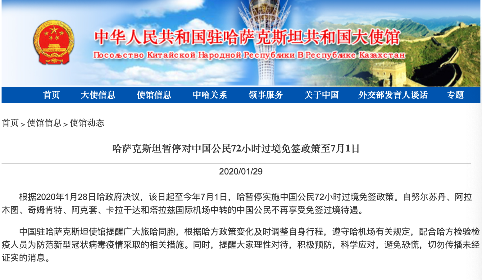 据中国驻哈萨克斯坦大使馆官网消息,根据2020年1月28日哈政府决议,该日起至今年7月1日,哈暂停实施中国公民72小时过境免签政策。自努尔苏丹、阿拉木图、奇姆肯特、阿克套、卡拉干达和塔拉兹国际机场中转的中国公民不再享受免签过境待遇。