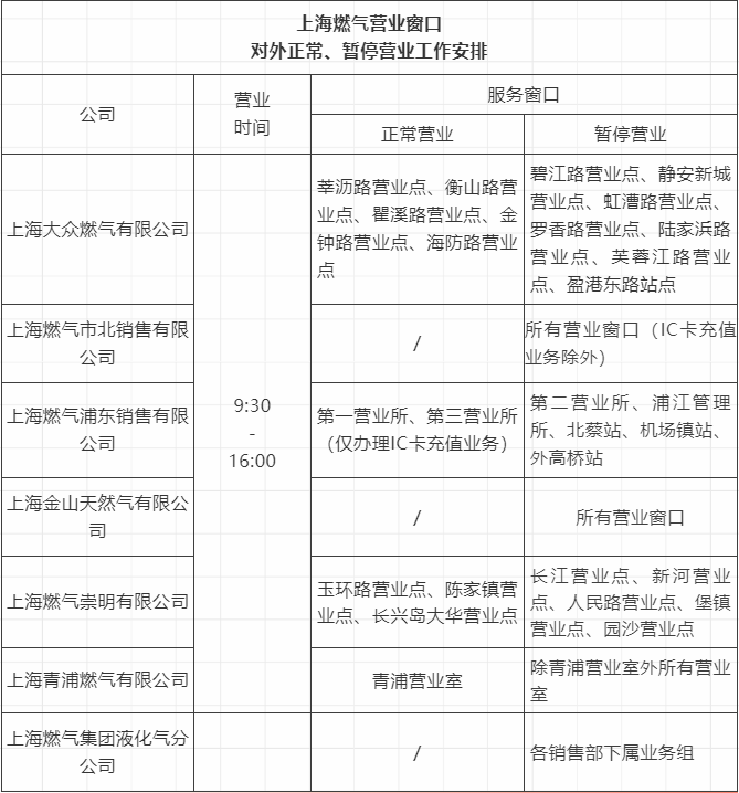 上海燃气营业窗口对外正常、暂停营业工作安排: