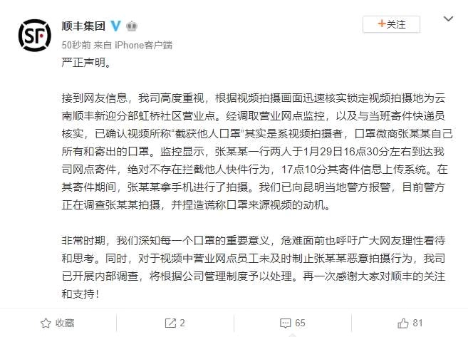 接到网友信息,我司高度重视,根据视频拍摄画面迅速核实锁定视频拍摄地为云南顺丰新迎分部虹桥社区营业点。经调取营业网点监控,以及与当班寄件快递员核实,已确认视频所称“截获他人口罩”其实是系视频拍摄者,口罩微商张某某自己所有和寄出的口罩。监控显示,张某某一行两人于1月29日16点30分左右到达我司网点寄件,绝对不存在拦截他人快件行为,17点10分其寄件信息上传系统。在其寄件期间,张某某拿手机进行了拍摄。我们已向昆明当地警方报警,目前警方正在调查张某某拍摄,并捏造谎称口罩来源视频的动机。