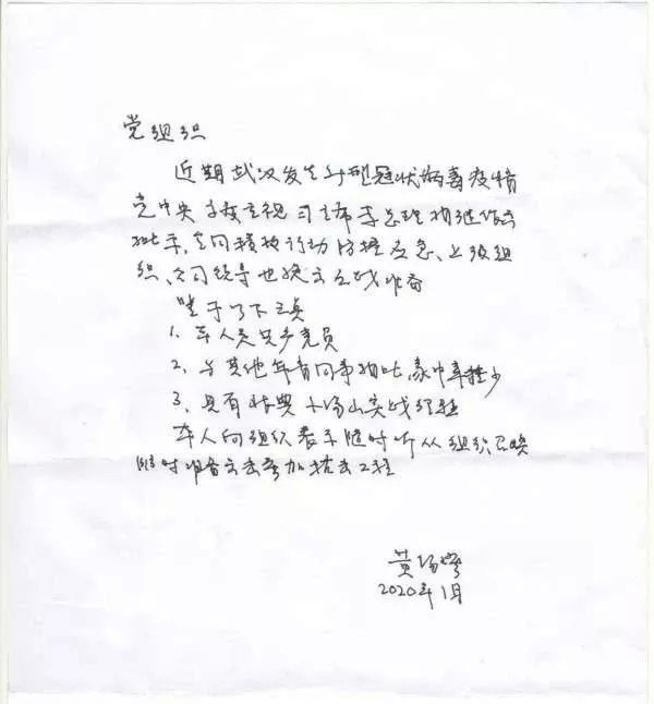 年近八旬的黄锡璆博士,还第一时间向组织递交了请战书,表达了作为共产党员、愿随时听从组织安排,赶赴一线,参加疫情抗击工作的决心。他写道:“本人是共产党员,与其他年青同事相比家中牵挂少,具有非典小汤山实战经验。本人向组织表示,随时听从组织召唤,随时准备突击参加抗击工作。”